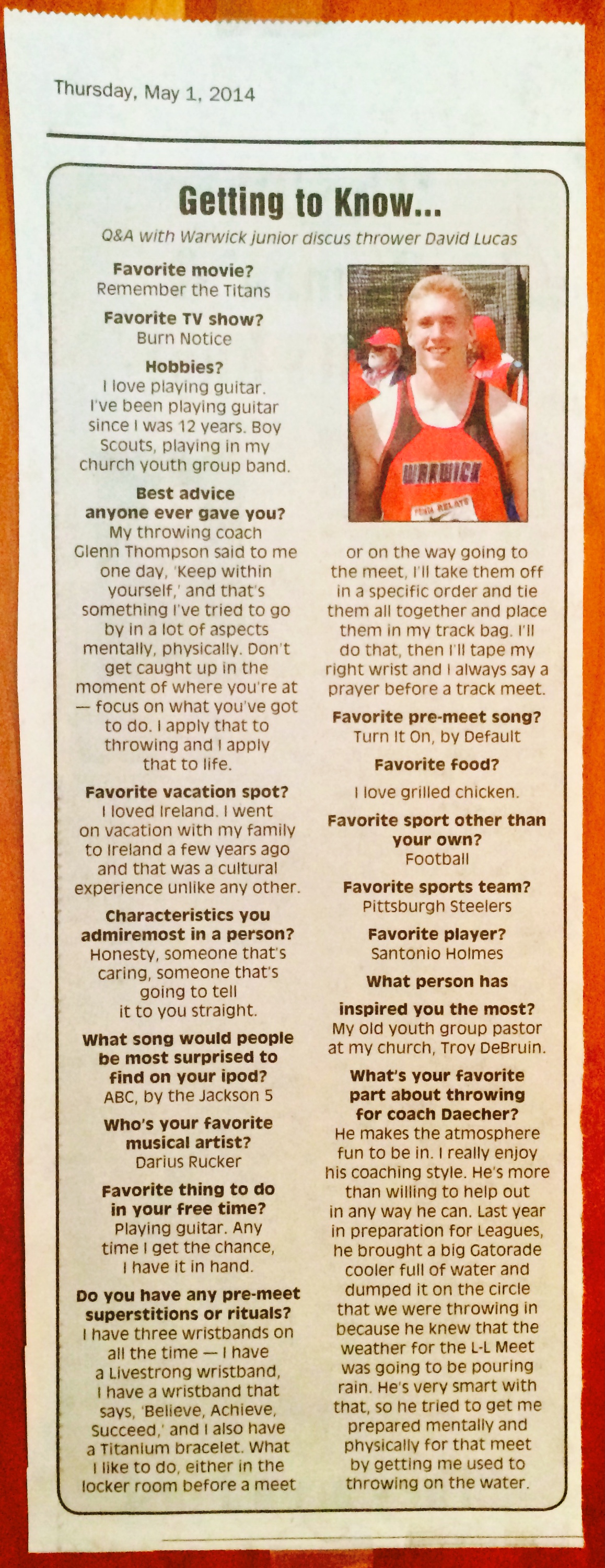 David Lucas of Lititz, PA is a top-ranked DISCUS thrower at Warwick High School, class of 2015. This blog was created to chronicle his progression from high school to the college ranks.