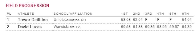 The 2015 edition of Penn Relays was certainly good to David as he produced his most impressive series of throws in his career, culminating with a new PR of 199-7 and a Silver medal behind the leading throw of Ohio senior Trevor Detillion (203-6).